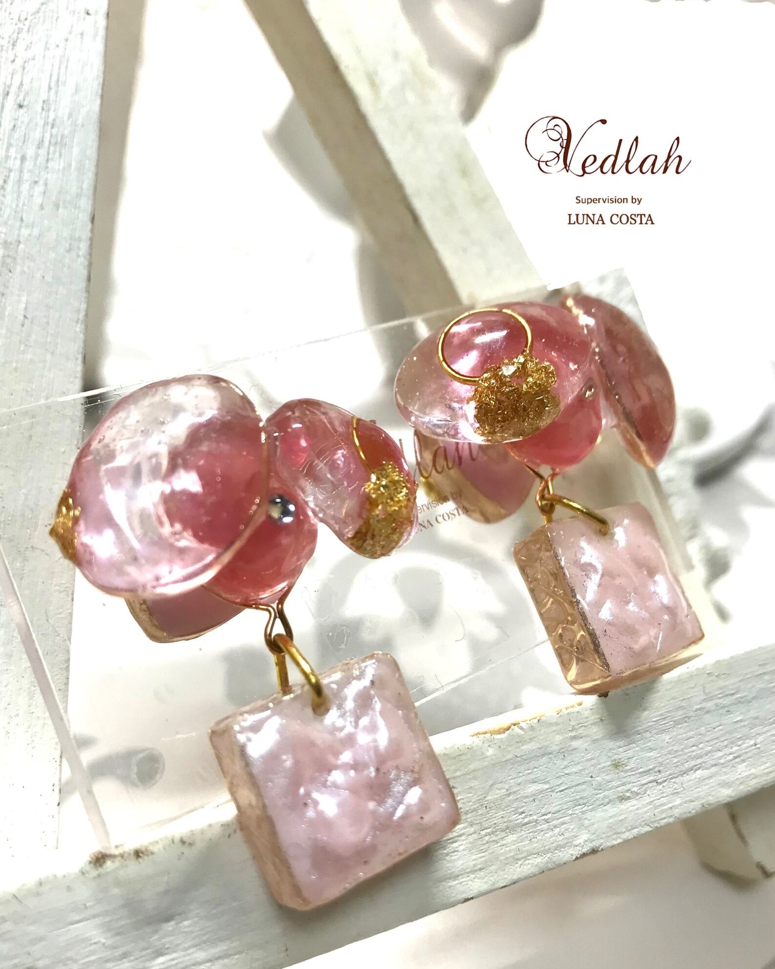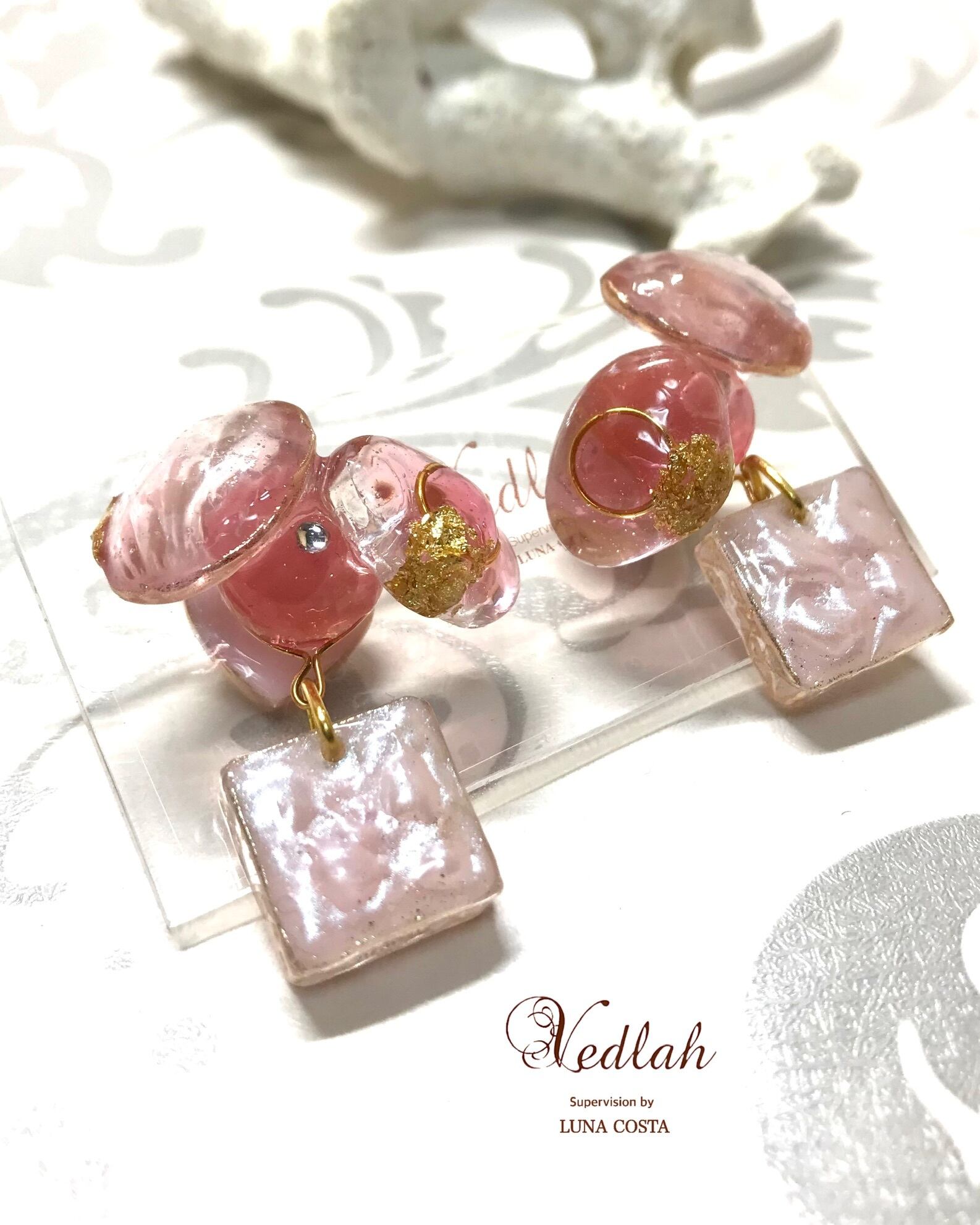 4種類のパーツを組み立てた艶ピンクのピアスは、ピアスキャッチもハート型で、360度どこから見ても、可愛くてオシャレ‼︎